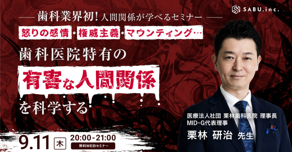 【ウェビナー】9月11日開催 歯科業界初!人間関係が学べるセミナー 〜 怒りの感情、権威主義、マウンティング…歯科医院特有の「有害な人間関係」を科学する〜